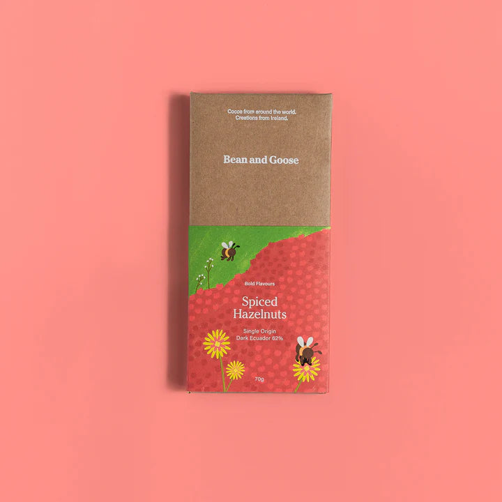 Strong notes of chili and dark chocolate are offset by sweet honey and smooth hazelnuts. We toast nibbed hazelnuts with warming spices and sweet 100% Irish honey. A generous handful of this mixture tops each dark chocolate bar.