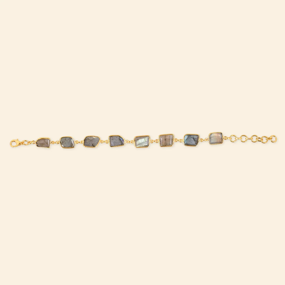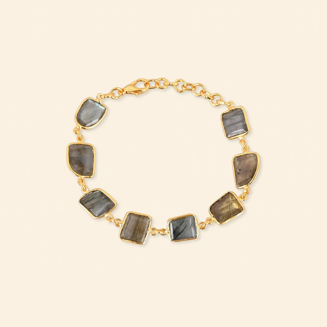 Linked bracelet featuring black Labradorite, celebrating divine intervention. This piece unites Rati, whose delicate threads wove desire into creation, with Isis, Egypt's master weaver who netted stars into constellations. The flowing patterns represent both Rati's love knots and Isis's sacred nets, embodying the artistry that weaves between earth and stars. Each stone is embraced by golden links.