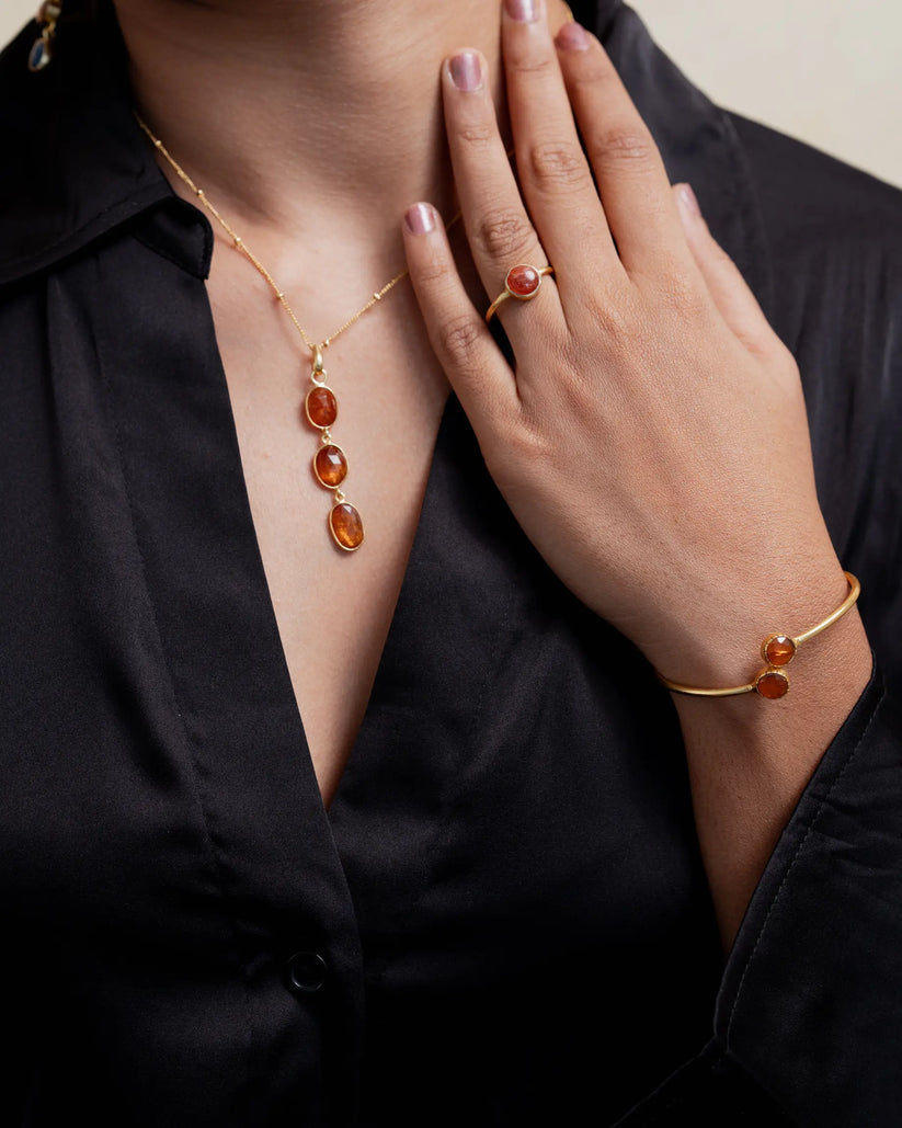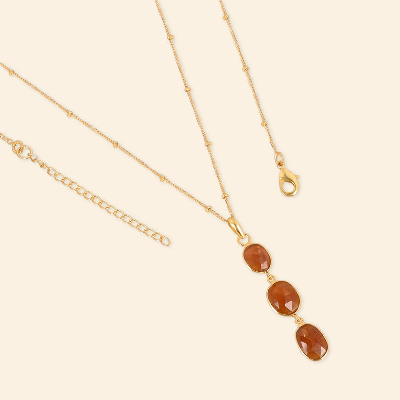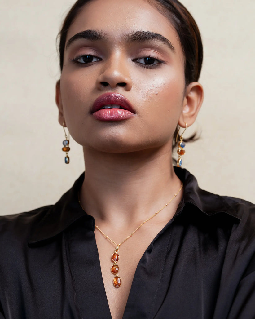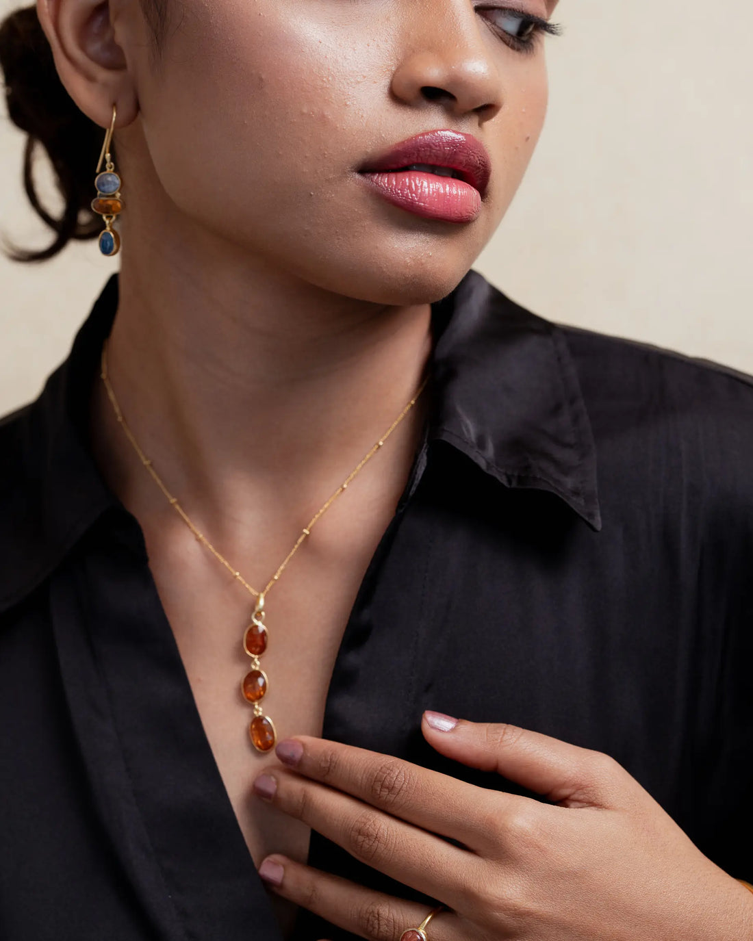 Triple-drop pendant featuring either Orange Kyanite, honoring the ancient water beings who shaped civilizations. The design draws inspiration from Matsya, Vishnu's fish avatar who saved the Vedic texts from the great flood, and Khnum, the Egyptian ram-headed god who molded humanity from the Nile's clay. The descending stones mirror the depths where these deities dwelled.