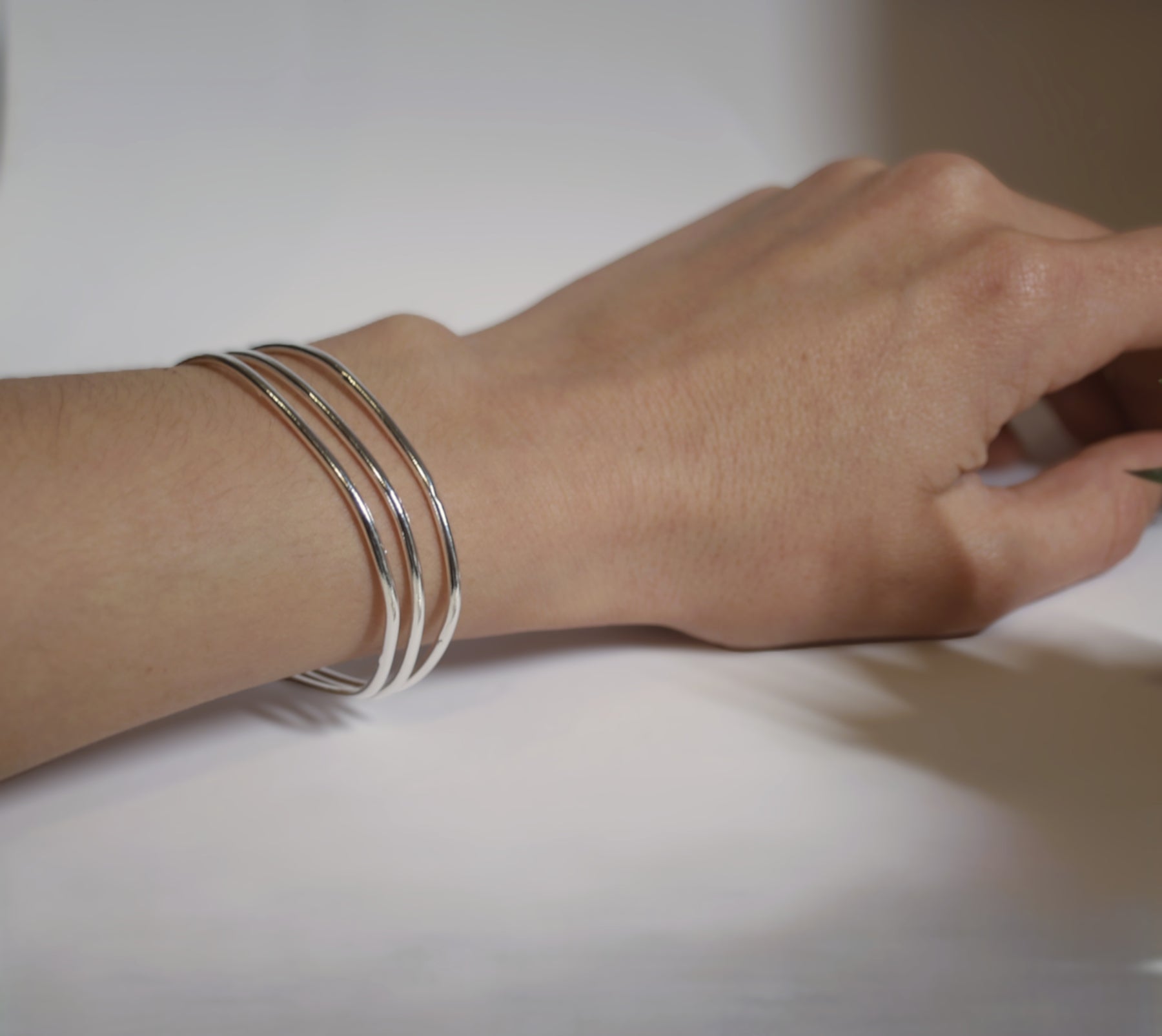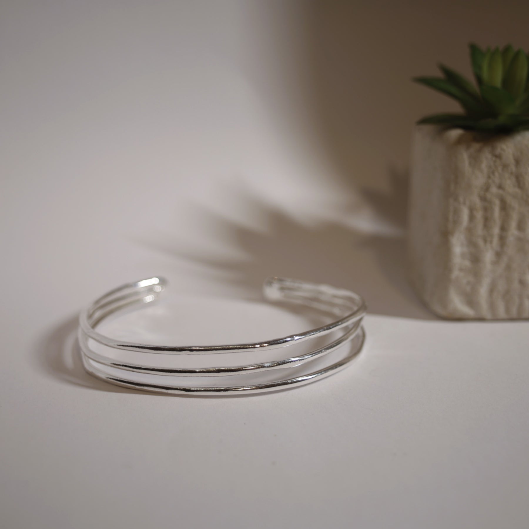 The Trinity Bracelet features three intertwined bands, creating a harmonious balance of texture and movement. Handcrafted with an artisanal touch, its minimalist yet striking adjustable design.