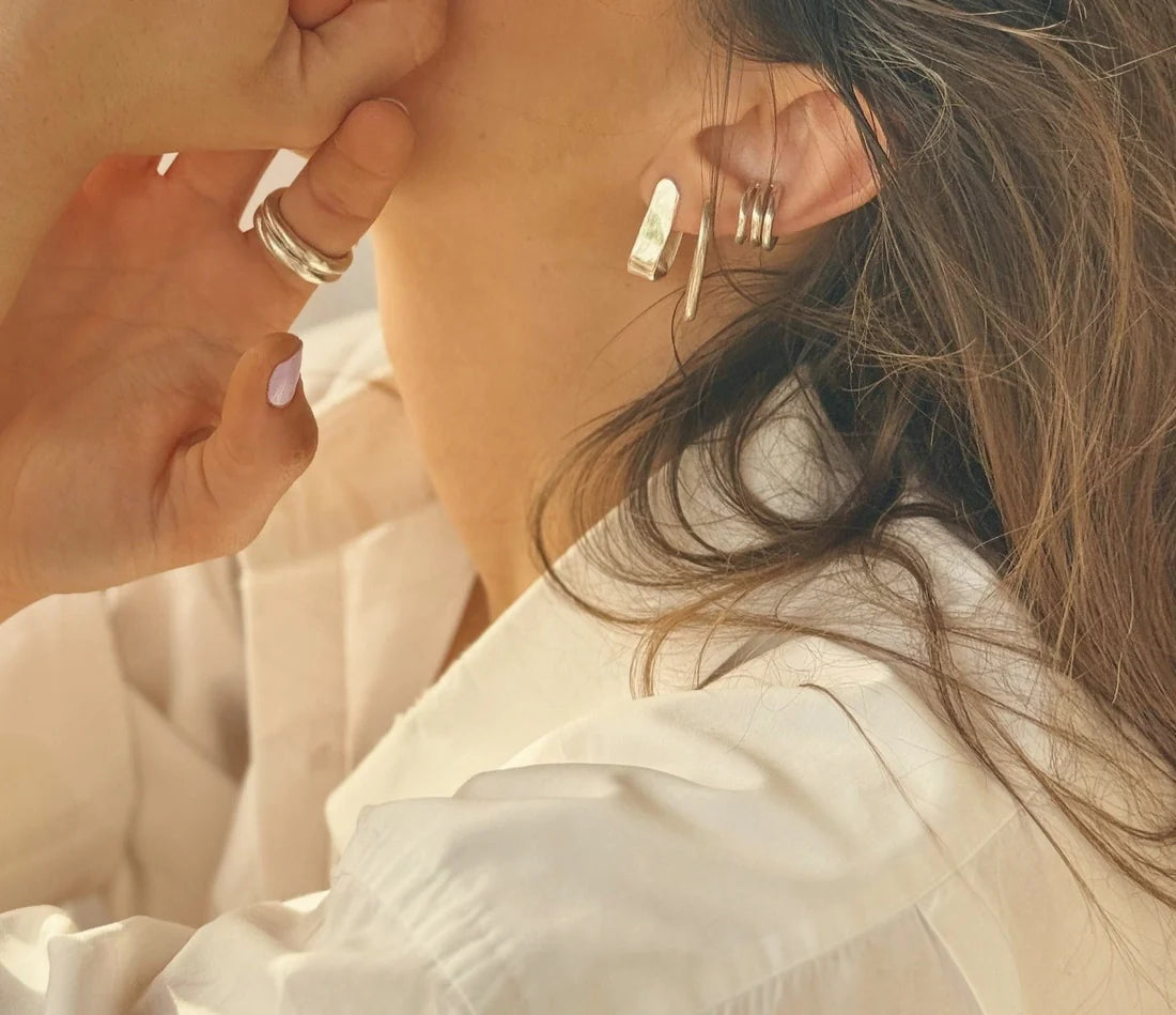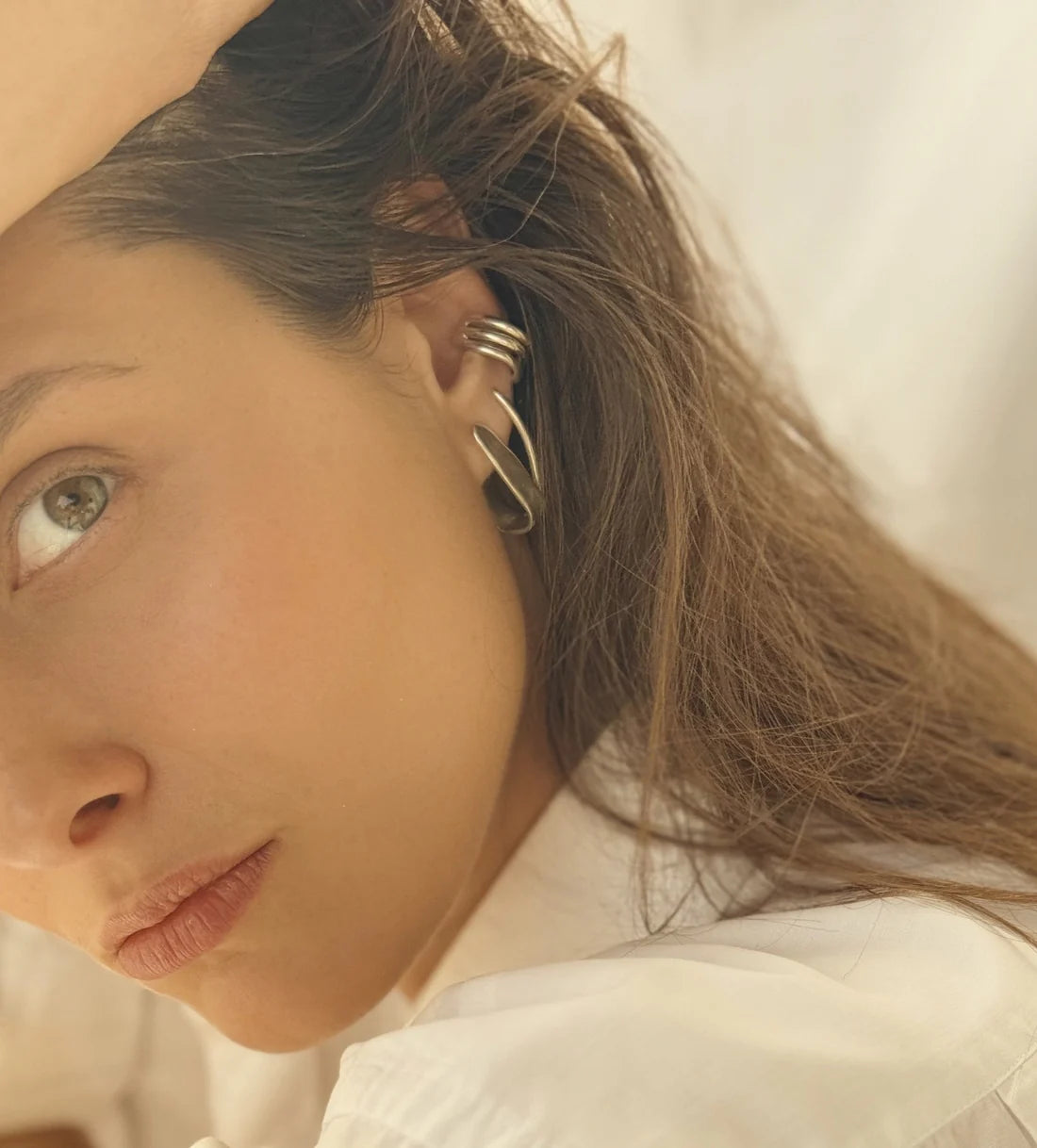 Chunky, non-piercing ear cuff, designed to wrap elegantly around the lobe. A sleek, triple-layered silver design that adds a bold statement to any look. A unisex ear cuff with modern drop hoop detailing.