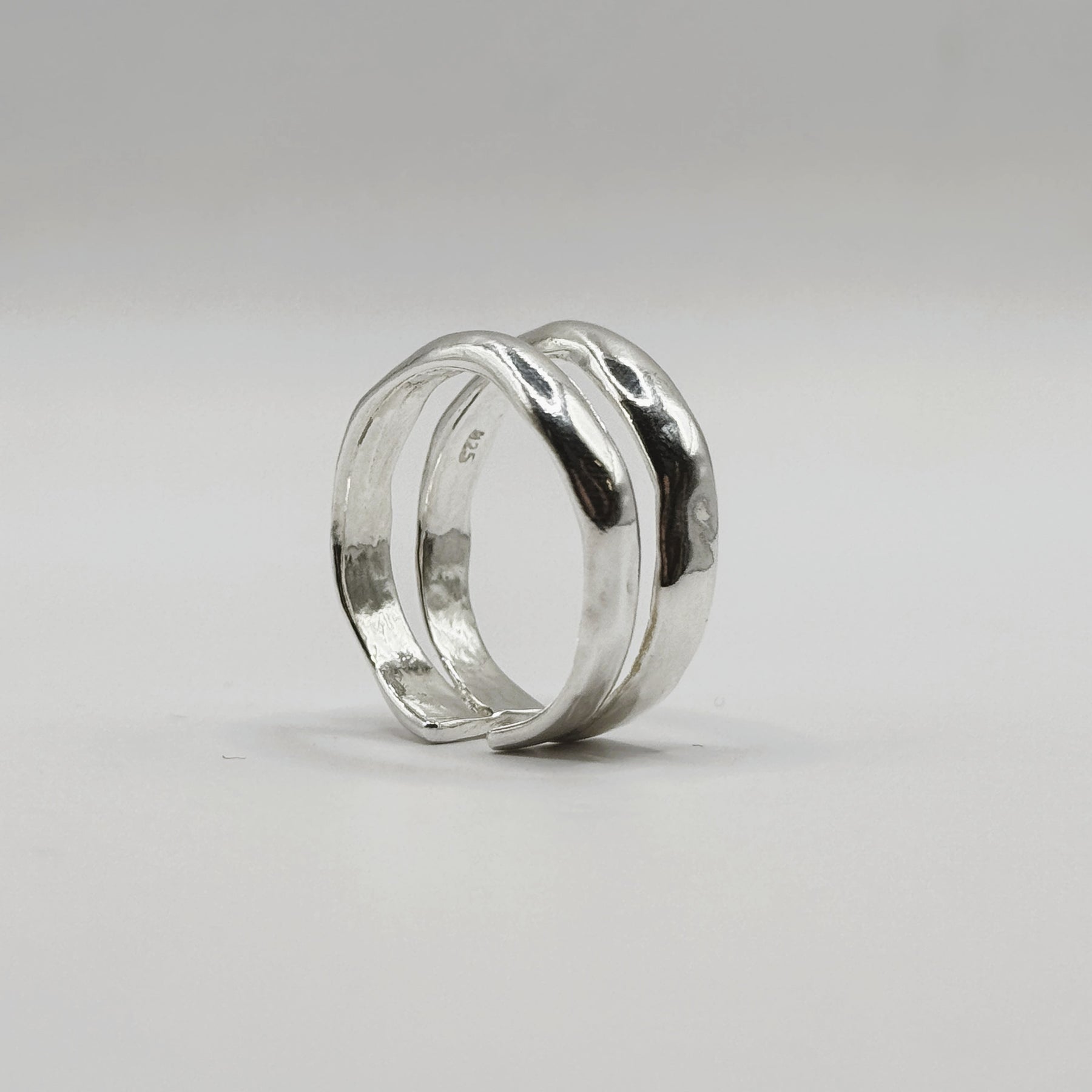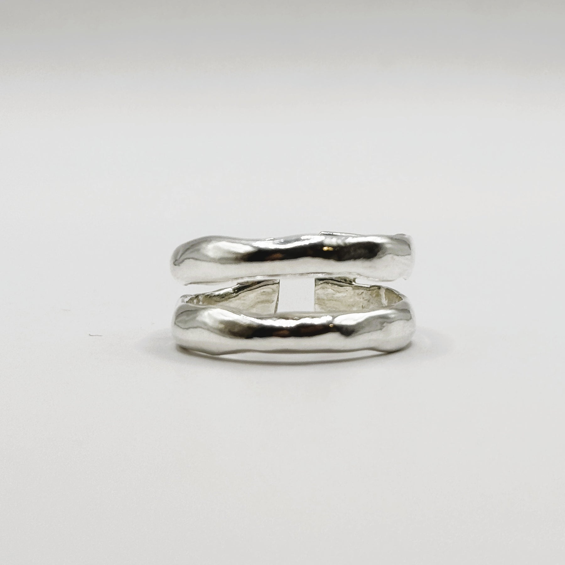 A raw silver duo band with a chunky, organic shape. Perfect for stacking or wearing alone, it blends bohemian charm with understated elegance.