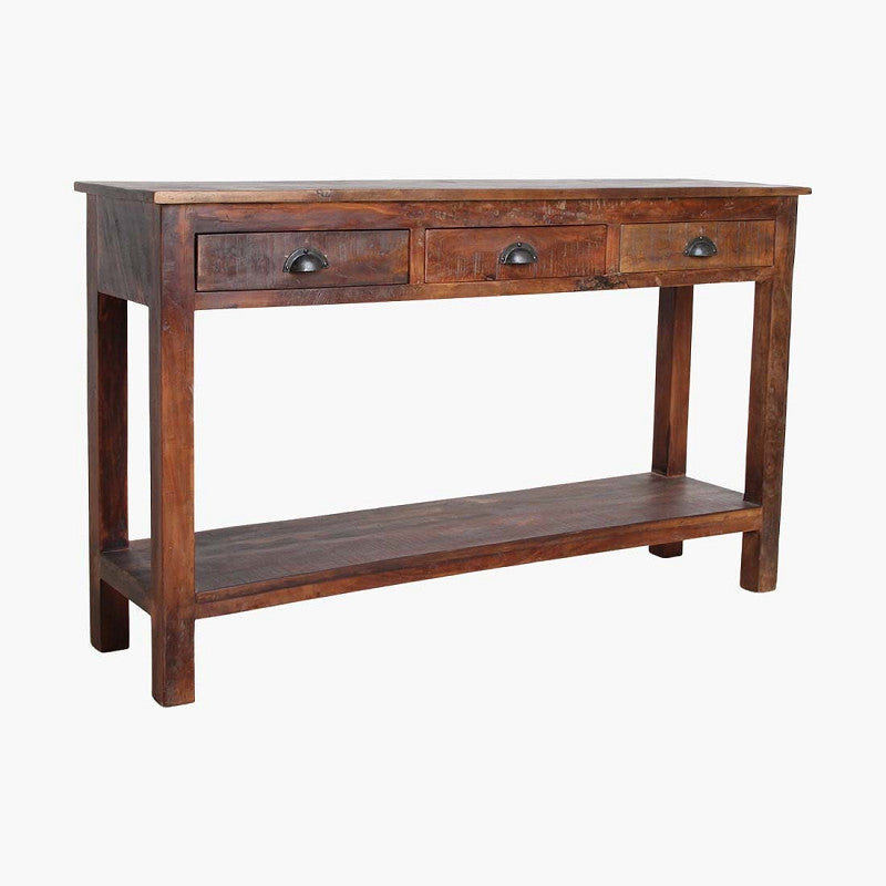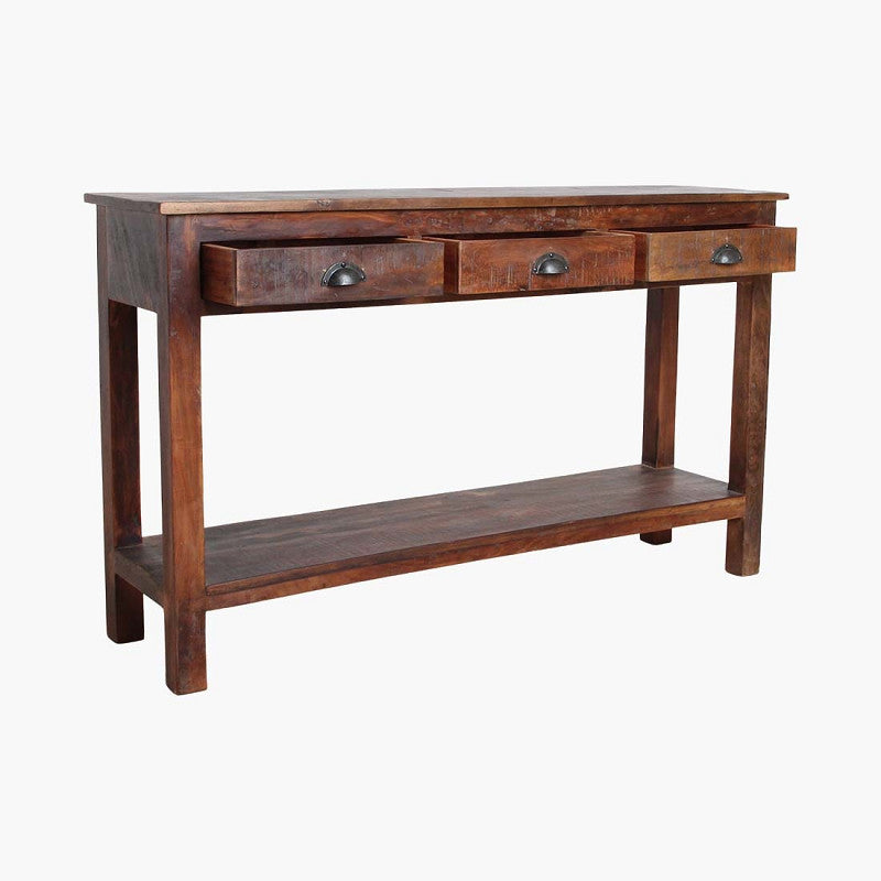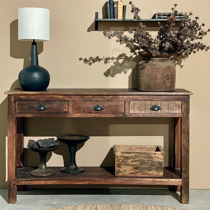 The side table from the Factory collection is a robust and stylish piece of furniture, crafted from recycled wood that imparts a unique and authentic character to any interior. This table features three spacious drawers with sturdy iron handles, perfect for neatly storing various items. Additionally, the lower shelf provides extra storage space for books, decorative objects, or other essentials. With its industrial charm and sustainable materials, this side table is an ideal complement to both modern and classic interiors.