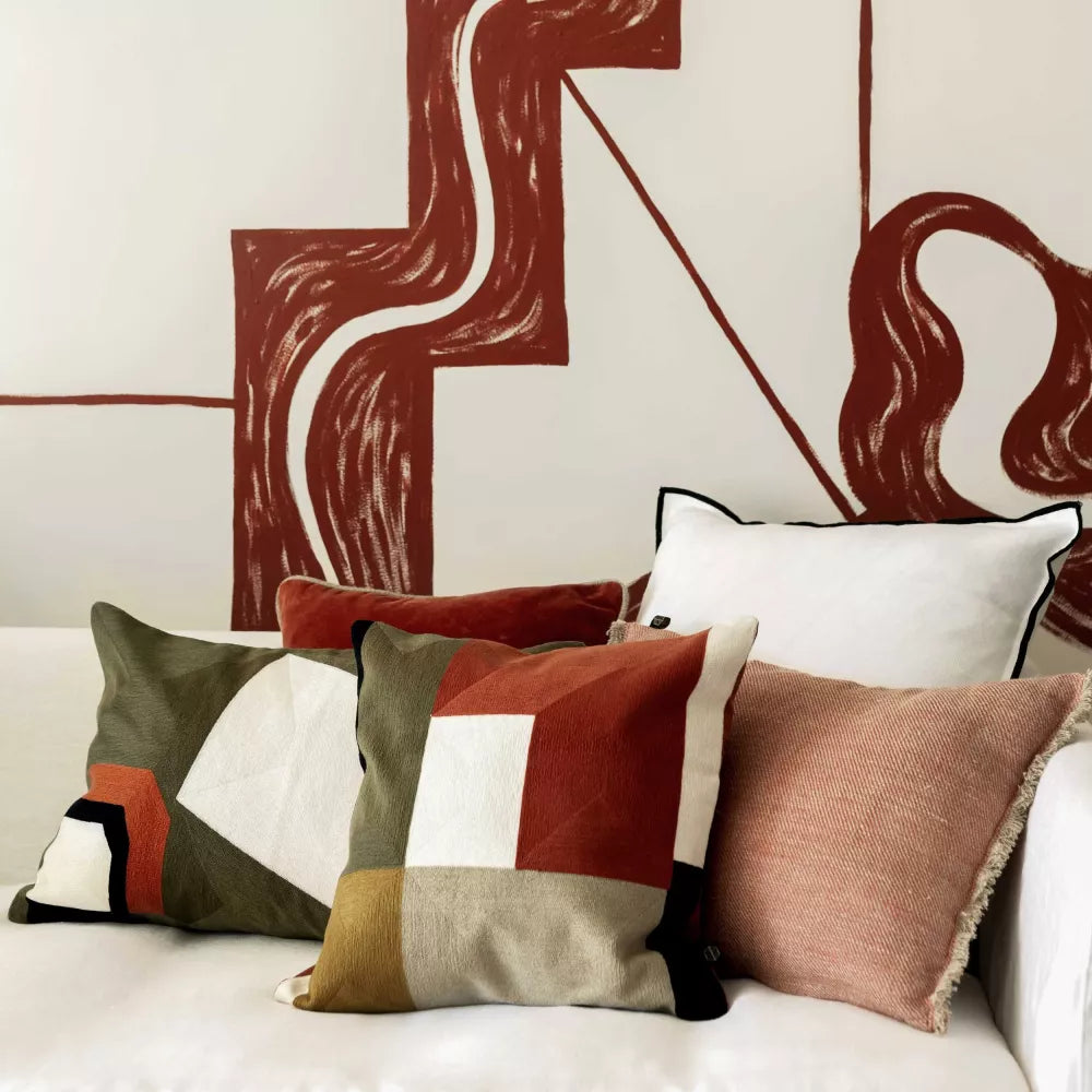 The Tamba cushion from Haomy is 100% cotton. It features one side embroidered with geometric shapes and one plain side, and it closes with a zipper. It will look perfect on a sofa or on a bed as a bed end.