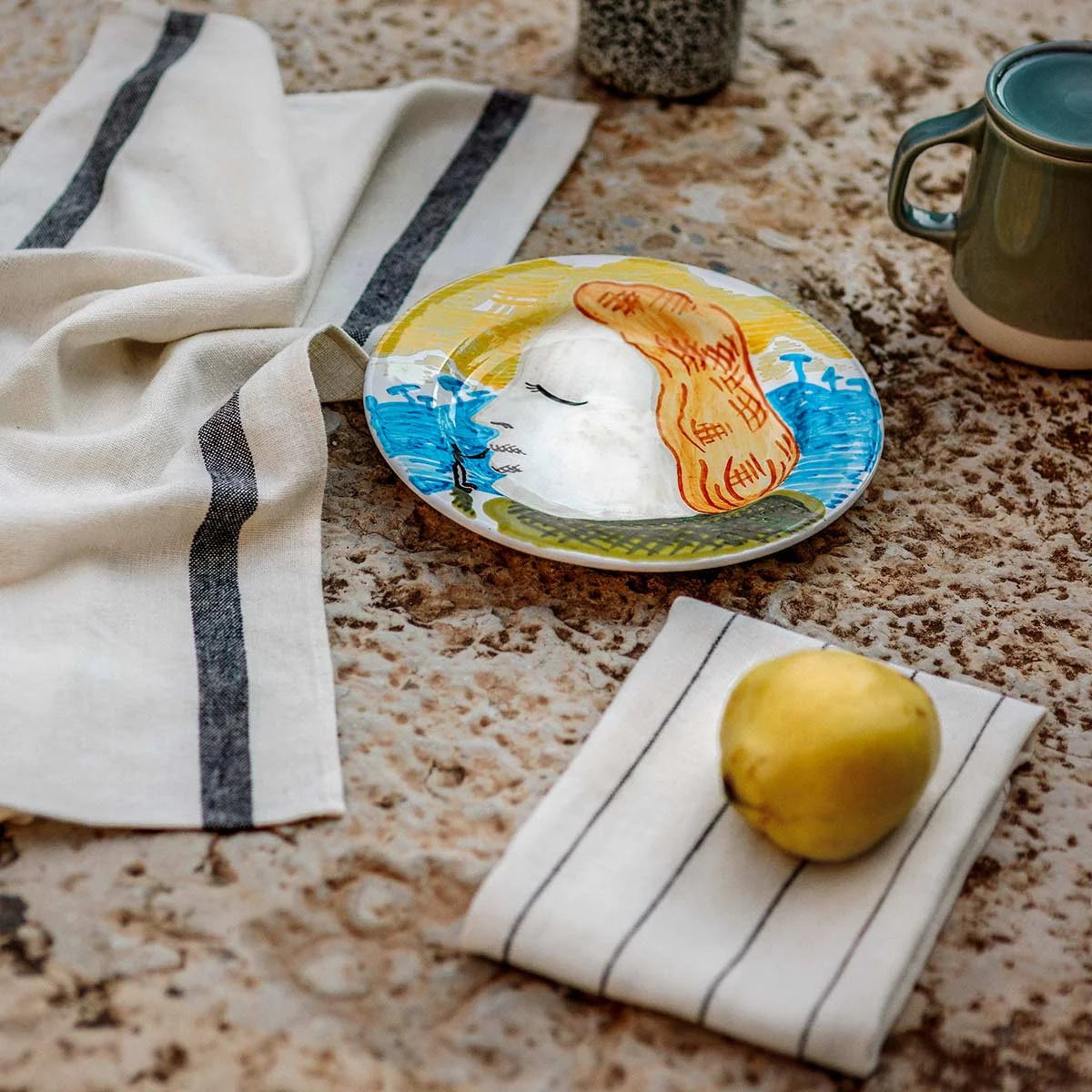 The Côme kitchen towel from Haomy is a washed linen and cotton tea towel. It has a small sewn-in hook to hang it wherever you want and it has two black stripes on the sides, the middle is plain.