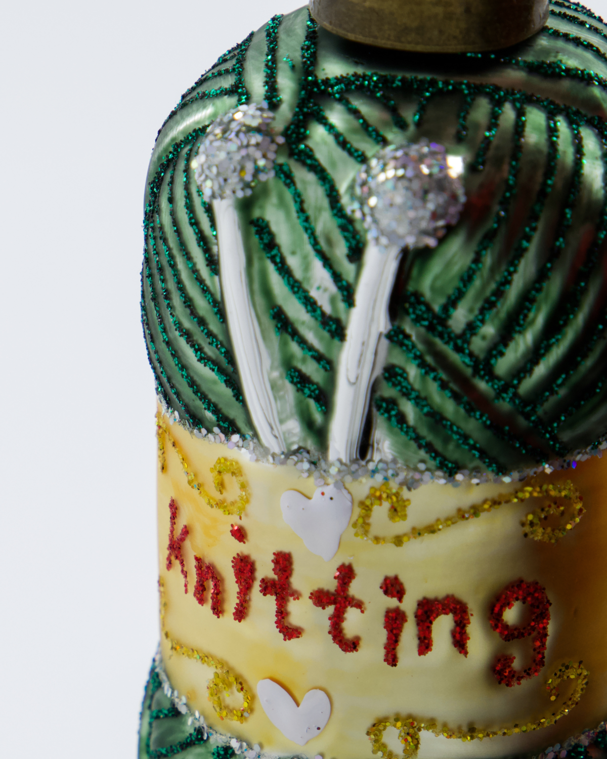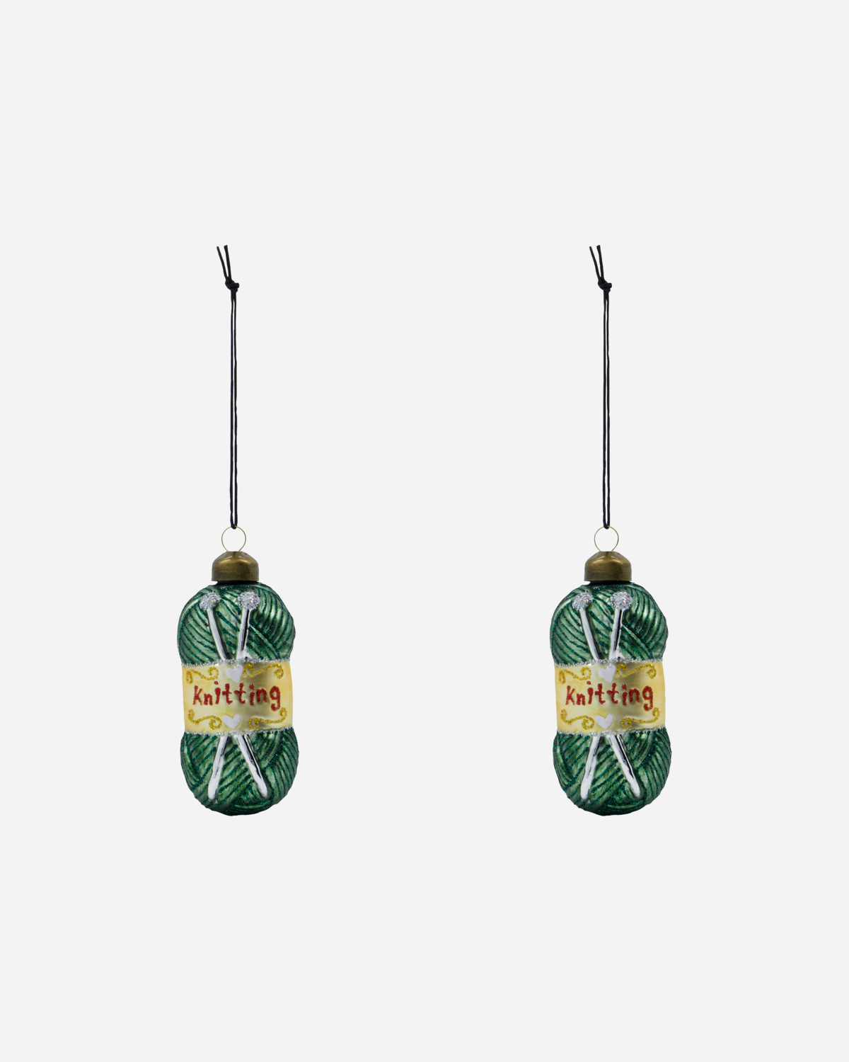 Add a touch of whimsy to your festive decor with these delightful dark green glass ornaments, adorned with green glitter. Mouth-blown and featuring charming yarn balls and knitting needles, they are perfect for those who love to knit. Enhance your Christmas tree with these unique and playful decorations.