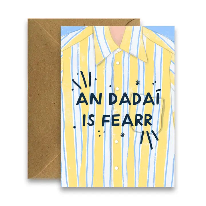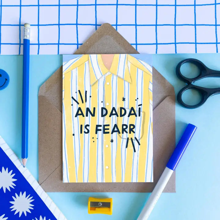 A hand-illustrated Irish language card for Dad, featuring the phrase “An Dadai Is Fearr” (The Best Dad). Designed in Ireland, this card is part of my illustration-led range celebrating Irish language, culture, and everyday moments. The style is bold, colourful, and modern, making it a popular choice for customers looking for contemporary Irish-language cards.
