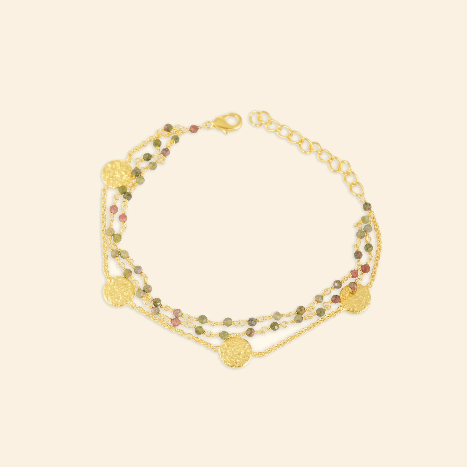 Inspired by the intricate patterns of ancient stepwells, Terra Lace is a triple-layer bracelet mirrors the interwoven paths of history. Adorned Multi stone Agate, each gem reflects the hues of weathered stone and timeworn artistry. The delicate chains, accented with textured gold discs, create an adjustable design that blends heritage with elegance.