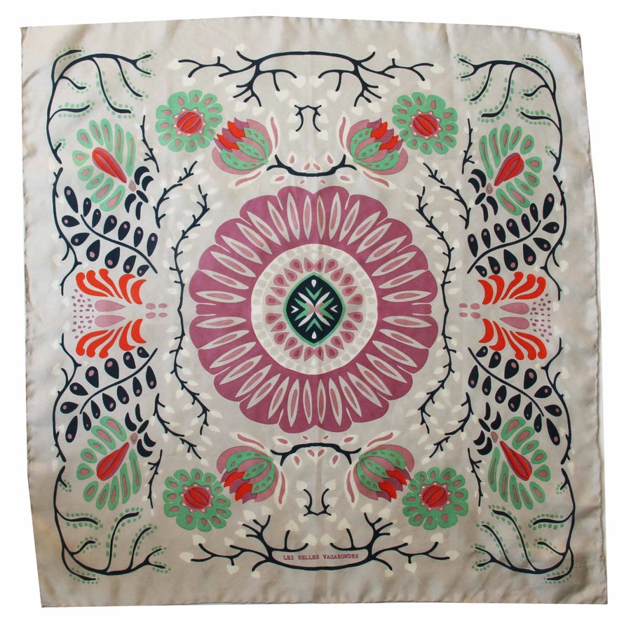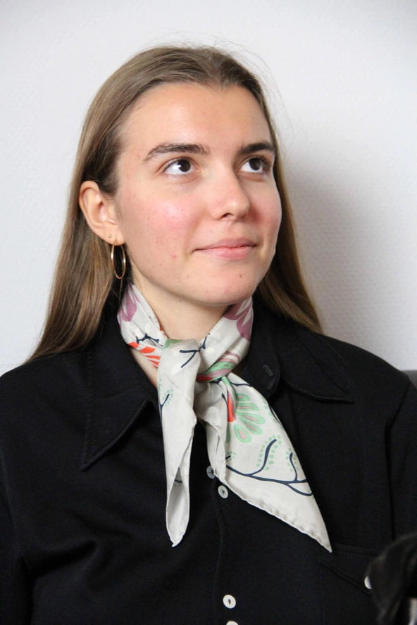 Les Belles Vagabondes's mini scarves make an original gift, they can be worn around the neck, around the wrist, as a headband, in a bun or even around the bag... They are drawn by hand in France and printed by hand in India. They have an exceptional finish with a hand-rolled hem. They are sold in a box inspired by vintage matchboxes.