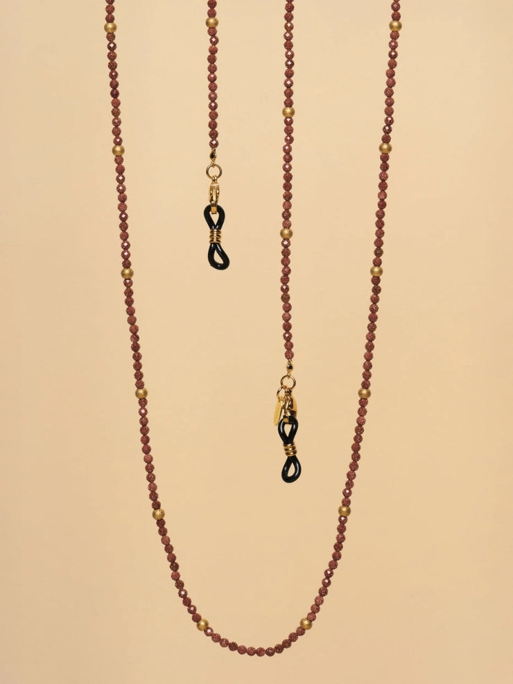 Channel timeless glamour with the Cleo eyeglass chain. Smooth glass beads and 18K gold-plated accents flow together in rich brown hues, designed to elevate any look with quiet sophistication. Light yet luxurious, Cleo brings a refined glow to both your glasses and sunglasses — an everyday essential with lasting beauty.